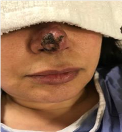 Hình 1. Mô hoại tử ở chóp mũi 10 ngày Hình 2. Vết thương cải thiện sau liệu
