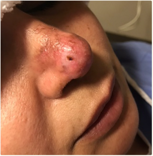 ※ Case 1: Bệnh nhân nữ 53 tuổi tiêm filler mũi, không xử lý kịp nên hoại tử da mũi. Sau 25 buổi oxy cao áp (HBOT), vết thương cải thiện rõ, chỉ còn sạm da nhẹ.